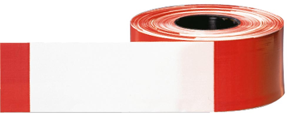 · Aus Polyethylen · Reißfest ∙ Beidseitig mit senkrechten rot/weiß oder schwarz/gelb Schraffen lichtecht bedruckt ∙ Breite 80 mm ∙ Länge 500 m ∙ In stabilem Abrollkarton