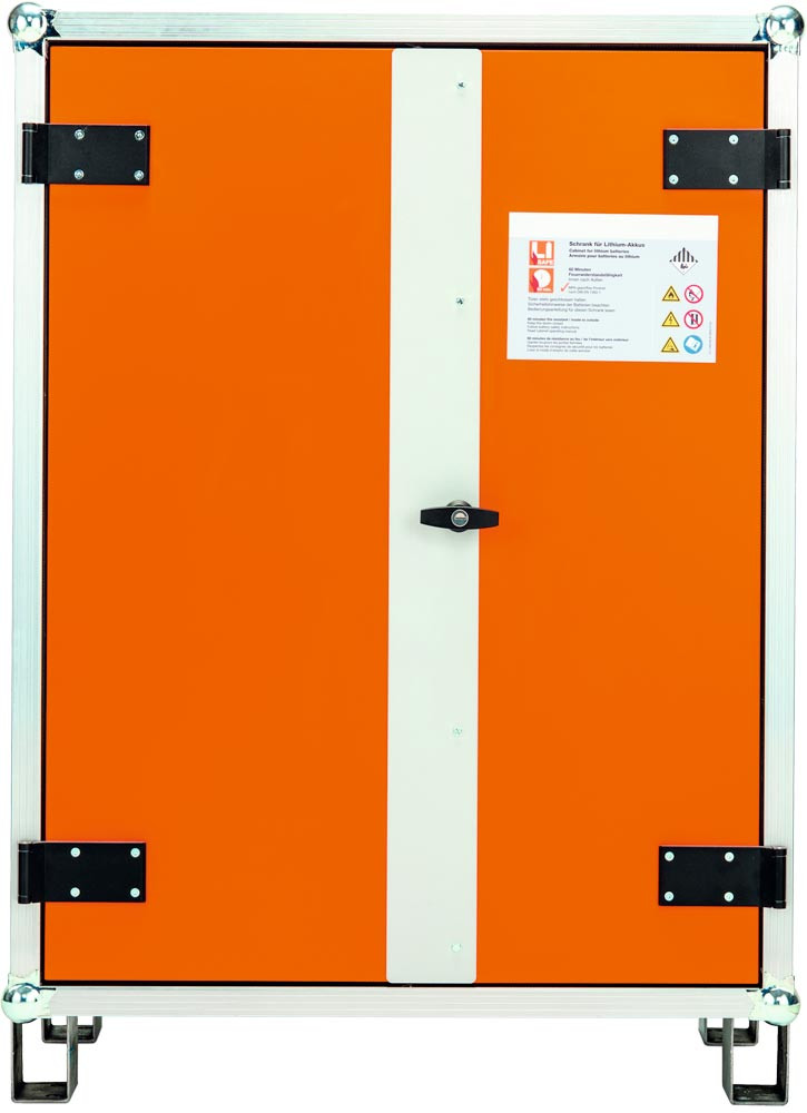 Akku-Ladeschrank, Basis, Rauchmelder, techn. Lüftung, BxTxH 800x660x1110 mm, Tür orange, Stapelfüße, Korpus grau