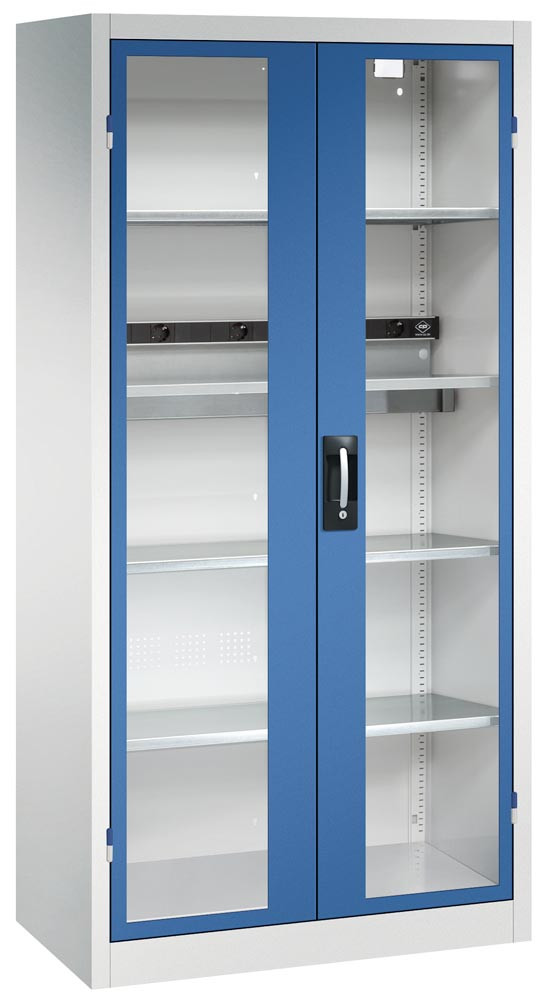 Akkulade-Schrank, Sichtfenster-Türen, BxTxH 930x500x1950 mm, 1 Boden mit 5-fach Steckdosenleiste,3 Einlegeböden, RAL 7035/5010 EP554771