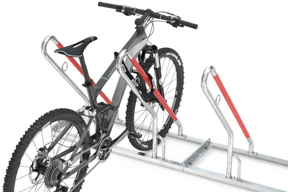 · Korrosionsgeschütze Stahlkonstruktion · Radabstand 500 mm (einseitige Ausführung) bzw. 540 mm (zweiseitige Ausführung) · Der Anlehnbügel verhindert ein Umfallen des Fahrrades · Kunststoffummantelung als Anschlagschutz · Vorbereitet für Reihenverbindung · Bodenmontage-Winkel sind im Lieferumfang enthalten · Verzinkte Bodenanker sind separat erhältlich
