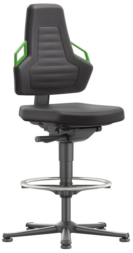 Arbeitsdrehstuhl mit autom. Gewichtregulierung, Sitz Stoff schwarz, Griffe grün, Gleiter u. Fußring, Sitz Höhe 570-820 mm