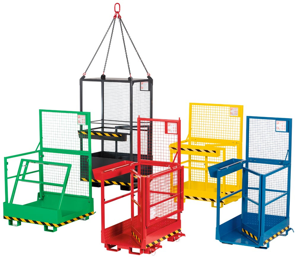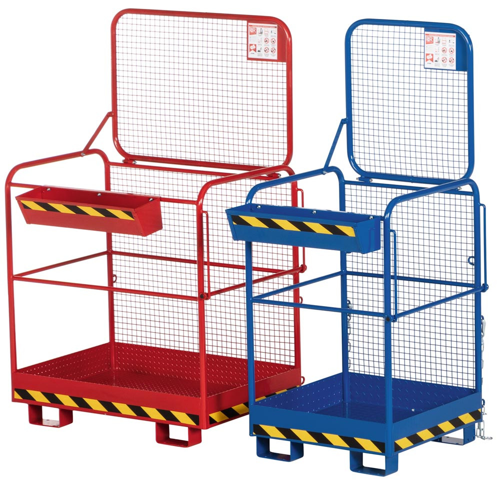 · TÜV geprüfte Sicherheit, entsprechend der DGUV (Deutsche gesetzliche Unfallversicherung) · Stabile Stahlkonstruktion mit rundum Absturzsicherung aus Rohr gemäß UVV · Arbeitskörbe mit TÜV-Zulassung für 2 Personen · Arbeitsplattform aus rutschsicherer Tränenblechkonstruktion mit Abrollschutz · Steckbolzensicherung verhindert das Abrutschen von den Gabelzinken · Pulverbeschichtet · Verzinkte Ausführung auf Anfrage lieferbar ∙ Klappbar auf der Seite der Einfahrtaschen
