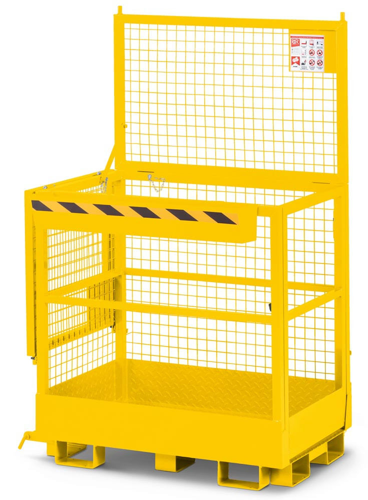 Arbeitskorb mit Aufnahme von der Breitseite und Schmalseite, Zulässig für 2 Personen, BxTxH 1200x800x1950 mm, Traglast 300 kg, RAL 1023 verkehrsgelb