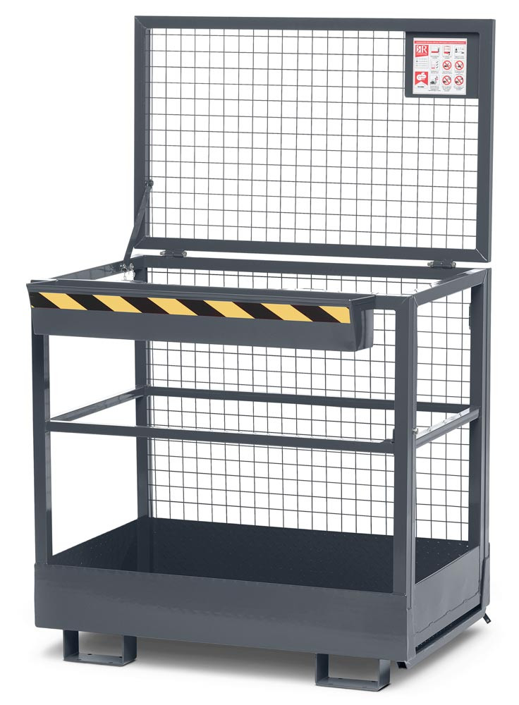 · TÜV geprüfte Sicherheit, entsprechend der DGUV (Deutsche gesetzliche Unfallversicherung) · Stabile Stahlkonstruktion mit rundum Absturzsicherung aus Rohr gemäß UVV · Arbeitskörbe mit TÜV-Zulassung für 2 Personen · Arbeitsplattform aus rutschsicherer Tränenblechkonstruktion mit Abrollschutz · Steckbolzensicherung verhindert das Abrutschen von den Gabelzinken · Pulverbeschichtet · Verzinkte Ausführung auf Anfrage lieferbar ∙ Klappbar auf der Seite der Einfahrtaschen
