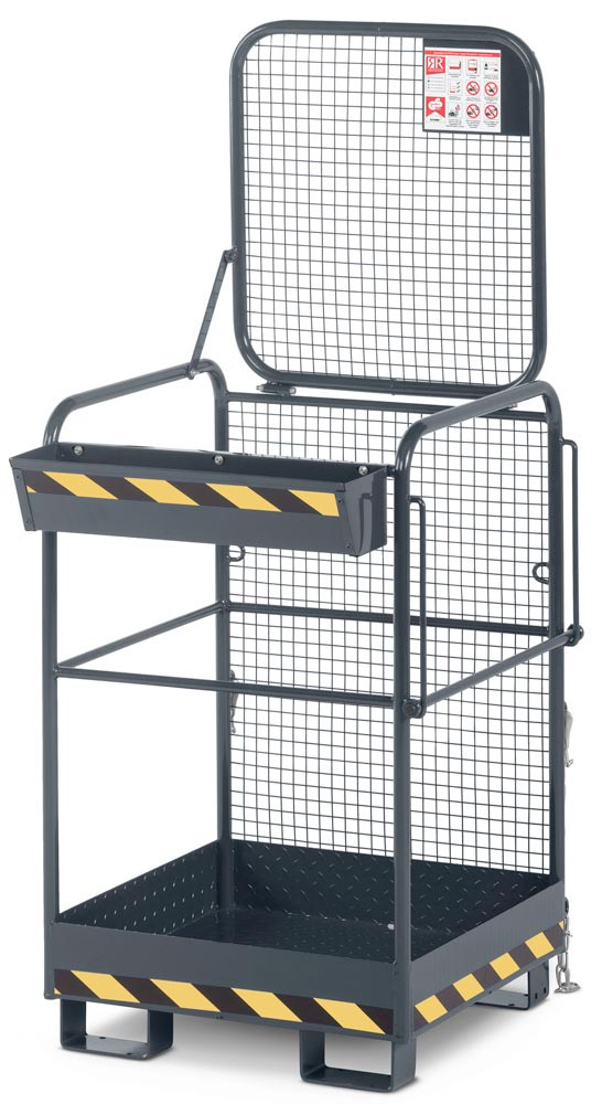 · TÜV geprüfte Sicherheit, entsprechend der DGUV (Deutsche gesetzliche Unfallversicherung) · Stabile Stahlkonstruktion mit rundum Absturzsicherung aus Rohr gemäß UVV · Arbeitskörbe mit TÜV-Zulassung für 2 Personen · Arbeitsplattform aus rutschsicherer Tränenblechkonstruktion mit Abrollschutz · Steckbolzensicherung verhindert das Abrutschen von den Gabelzinken · Pulverbeschichtet · Verzinkte Ausführung auf Anfrage lieferbar ∙ Klappbar auf der Seite der Einfahrtaschen