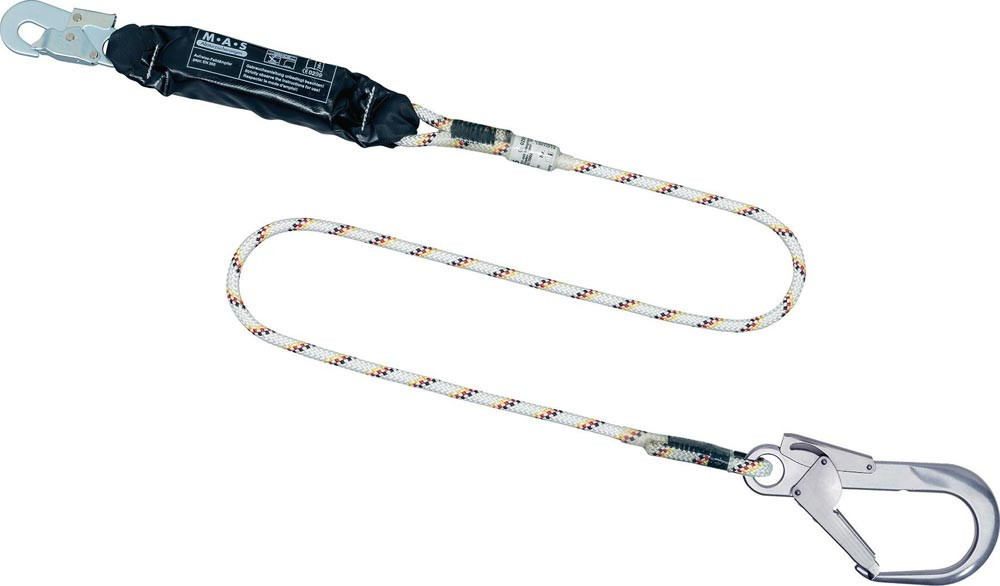 EN 354, EN 355 · mit Kernmantelseil 12 mm · der Bandfalldämpfer reduziert die auftretenden Stoßkräfte weit unter die erlaubten Maximalwerte · diese Ausführung ist mit einem Gerüst-Rohrhaken mit einer Öffnungsweite von 65 mm ausgestattet, so dass ein schnelles Anschlagen an Gittermaste, Gerüstrohre usw. ermöglicht wird