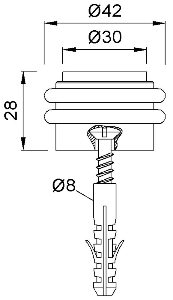 mit Befestigungsmaterial · Ø 42 mm · Höhe 28 mm · mit schwarzem Gummipuffer und 2 schwarzen Gummiringen · für Wand- und Bodenmontage