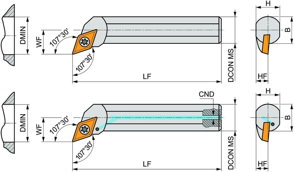 Dreh-Bohrstange mit Schraubklemmung zum spannen von 55° Rhombus positive Wendeschneidplatten mit einem Innenkreisdurchmesser von 9.525mm · 3.97mm Dick (ISO Bezeichnung DC.. 11T3.. ) · linke Ausführung zum 107°30' Längsdrehen mit abgesetzem Schaft · Stahl mit Kühlkanalbohrung · 32mm Durchmesser x 250mm Länge für Innenkegeldrehen und Längsdrehen mit und ohne Schulter