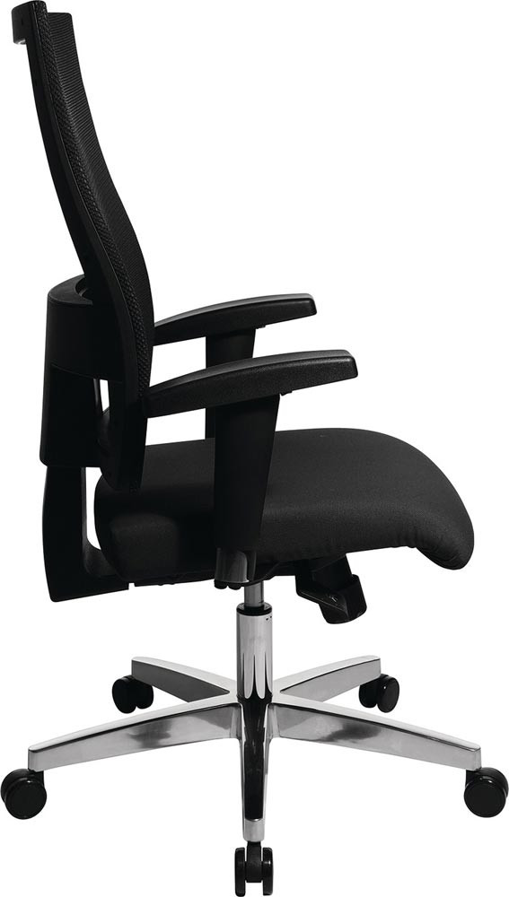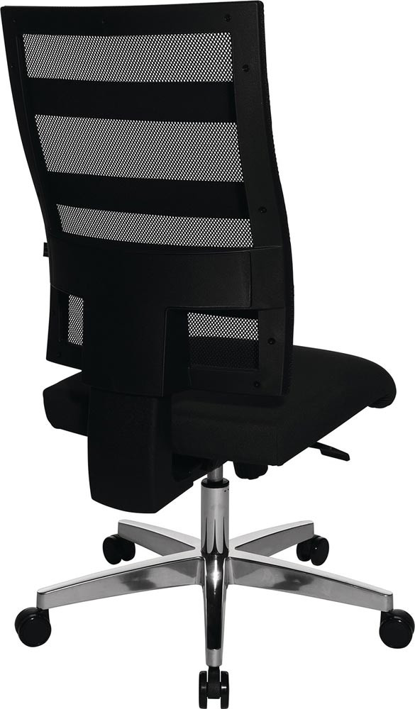 mit Punkt-Synchron-Technik (ohne Armlehnen) · für überwiegend sitzende Tätigkeiten · Aluminiumfußkreuz poliert · Rückenlehne mit atmungsaktiver Netzbespannung schwarz, Rückseite mit elastischen Gummibändern, höhenverstellbar · Flachsitz mit komfortabler Knierolle · Bezug Rückenlehne 100 % Polyester, Sitzfläche 100 % Trevira CS · Sitzfläche B 480 x T 480 mm · Lehnenhöhe 600 mm · Rollen für weiche Böden · Lieferung erfolgt zerlegt