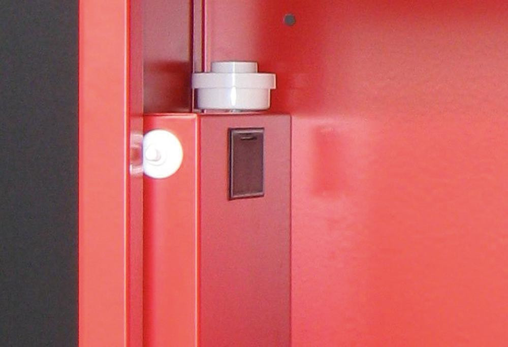 · Stabile Stahlblechkonstruktion · Oberfläche pulverbeschichtet · 3 Ausführungen erhältlich · Tür mit Sichtfenster und Kennzeichnung " Defibrillator " (Aufkleber) · Mit Drehverschluss · Sichtfenster aus bruchsicherem Acrylglas