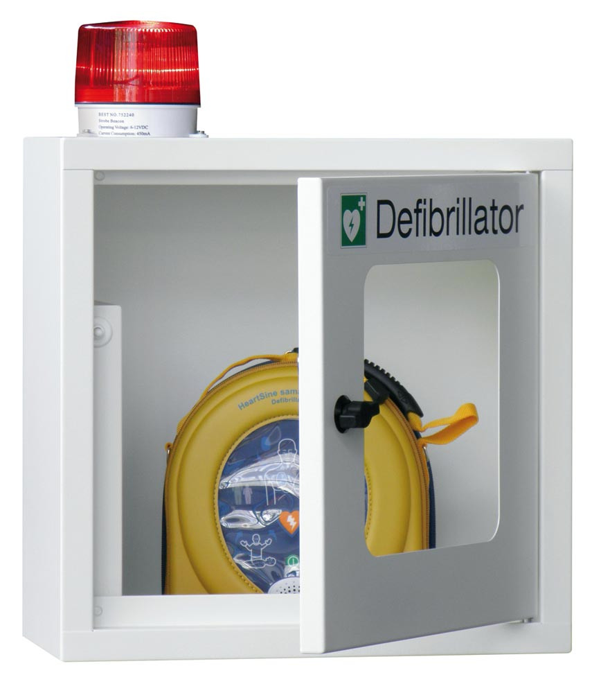 · Stabile Stahlblechkonstruktion · Oberfläche pulverbeschichtet · 3 Ausführungen erhältlich · Tür mit Sichtfenster und Kennzeichnung " Defibrillator " (Aufkleber) · Mit Drehverschluss · Sichtfenster aus bruchsicherem Acrylglas