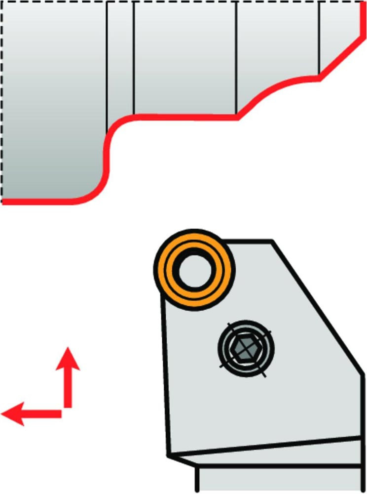 Dreh-Trägerwerkzeug mit Kniehebelklemmung zum spannen von Rund negative Wendeschneidplatten mit einem Durchmesser von 15.875mm · 6.35mm Dick (ISO Bezeichnung RN.. 150600 ) · rechte Ausführung zum Stirndrehen mit abgesetzem Schaft · 32mm Werkzeughöhe x 25mm Breite x 170mm Länge für Kegeldrehen · Stirndrehen ohne Schulter und Längsdrehen ohne Schulter