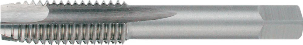 HSS · Form B · geradegenutet · Flanken hinterschliffen · metrisches ISO-Gewinde · DIN 13 Blatt 1 · Toleranzfeld ISO2 (6H) · mit Schälanschnitt · für Durchgangsgewinde · für unlegierte und niedriglegierte Stähle bis 800 N/mm² · das Gewinde kann von Hand und im Maschinengebrauch in einem Arbeitsgang geschnitten werden