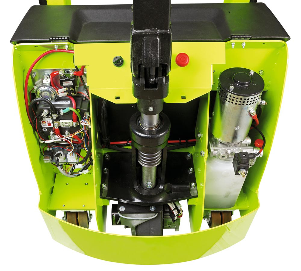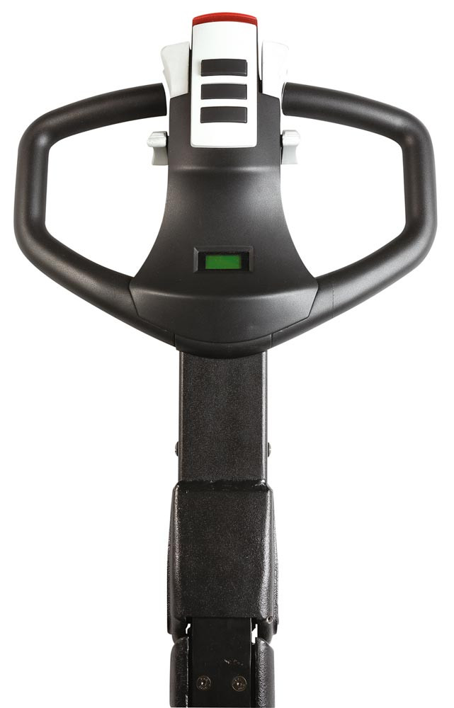 Alle Bedienelemente sind im Deichselkopf integriert: Fahrschalter, Heb-/Senkfunktion über Proportionalventile, Sicherheitskontaktschalter, Hupe, Betriebsstundenzähler und Batterieanzeige
