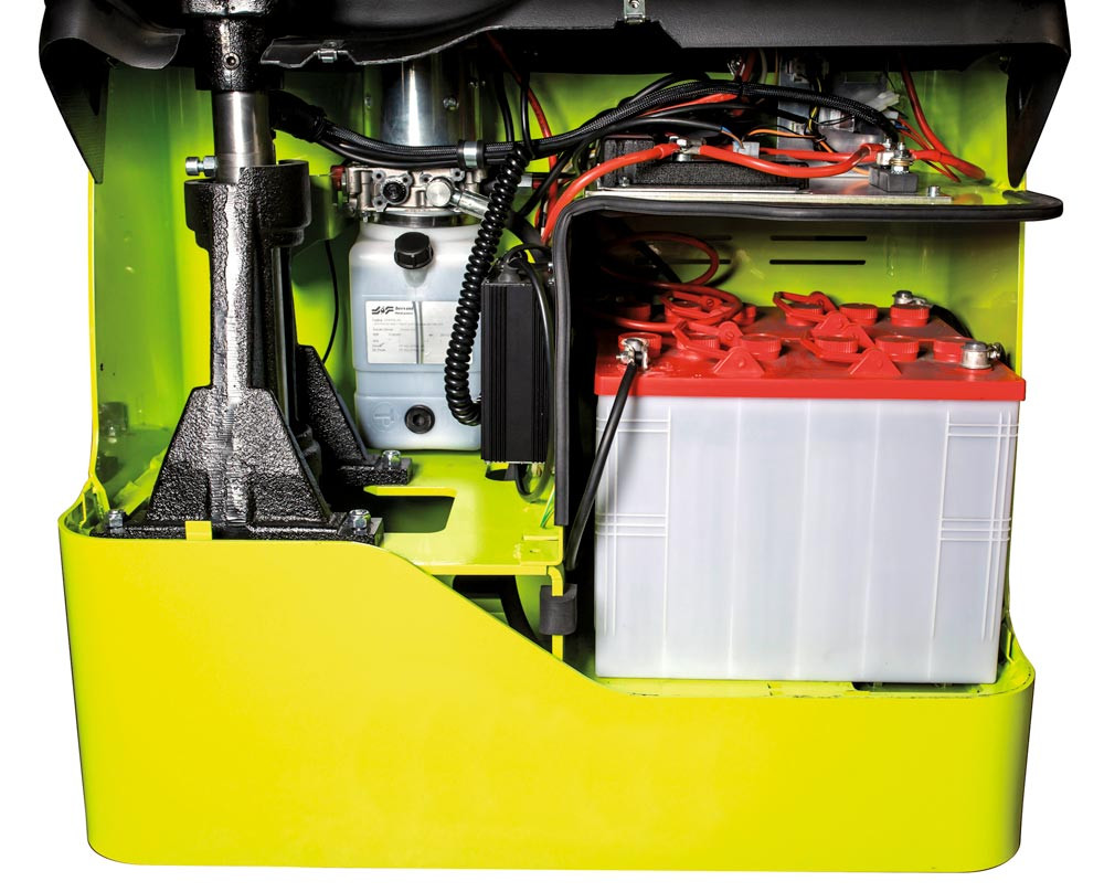 Alle Komponenten sich sehr gut zugänglich und versprechen einen geringen Wartungsaufwand. Über die Zugangsöffnung in der Bodenplatte sind Montagearbeiten an der Antriebseinheit möglich, ohne den Stapler anzuheben.