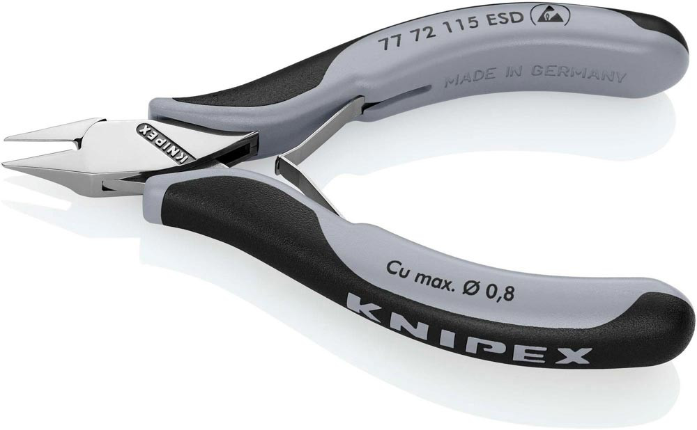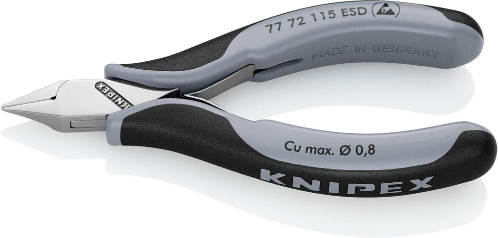 ESD · für feinste Schneidarbeiten z. B. in Elektronik und Feinmechanik · durchgestecktes, spielfreies Gelenk · Schneiden zusätzlich induktiv gehärtet, Schneidenhärte ca. 62 HRC · mit Öffnungsfeder · Spezial-Werkzeugstahl in Sondergüte geschmiedet, mehrstufig ölgehärtet · elektrisch ableitend - dissipativ