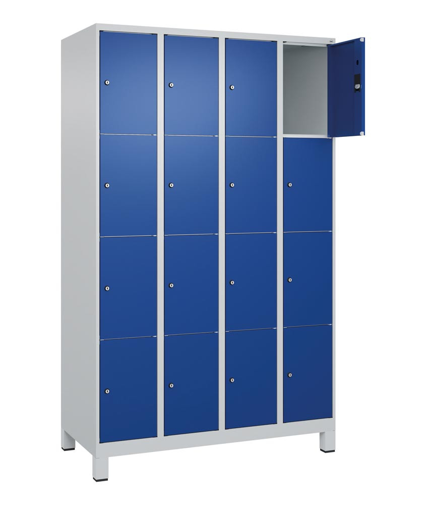 Fächerschrank, BxTxH 1200x500x1950 mm, 4x4 Fächer, Abt.B 300 mm, Füße, Schloss, glatte Türen, RAL 7035/5010