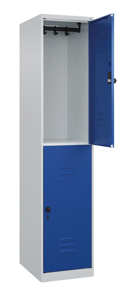 Fächerschrank, doppelstöckig, BxTxH 400x500x1850 mm, 1x2 Fächer, Abt.B 400 mm, Drehriegel, bodenstehend, RAL 7035/5010 EP559776