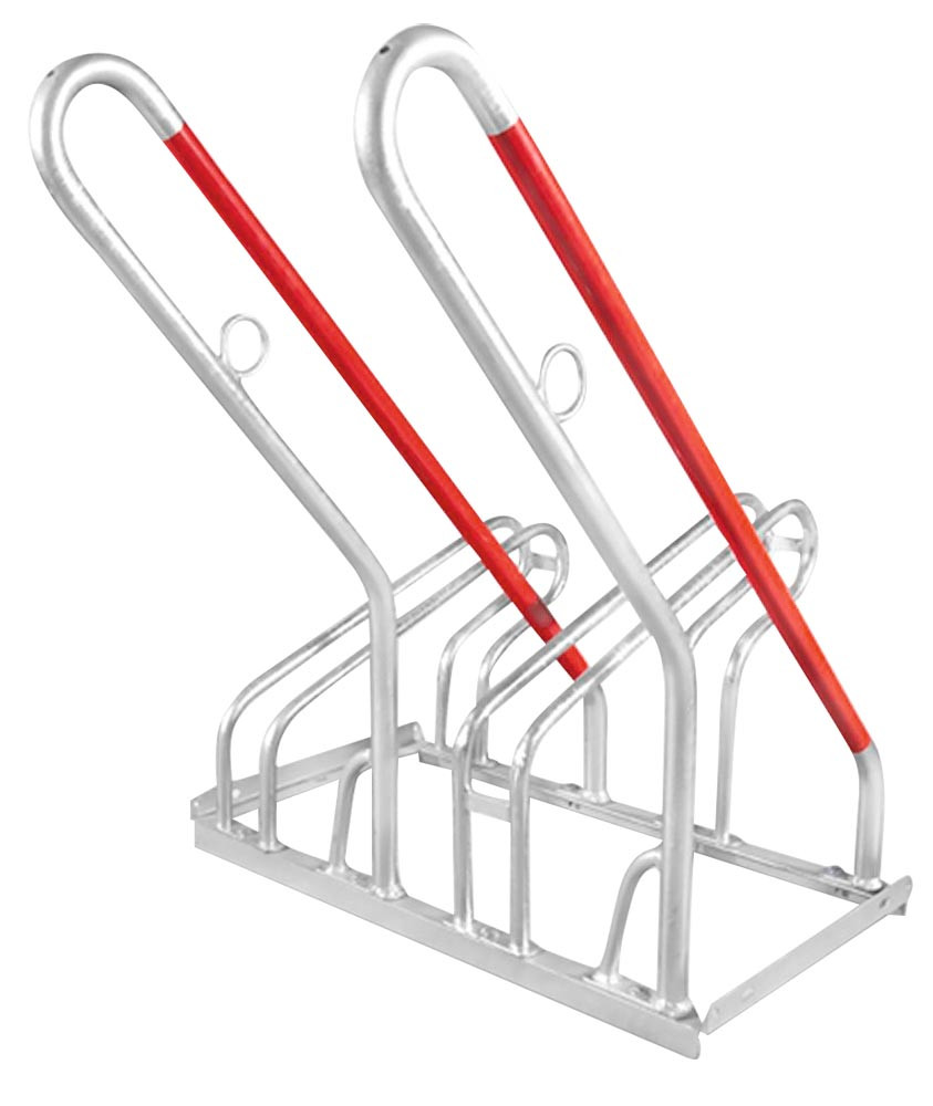 ∙ Aus feuerverzinktem Stahl ∙ Abwechselnd als Tief-Hochstellung ∙ Optmierte Diebstahlsicherung · Haltebügel für Reifenbreite bis 55 mm ∙ Vorbereitet zur Reihenverbindung und Bodenbefestigung