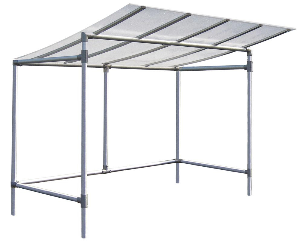 · Schlichte und preiswerte Überdachung, die sich mühelos in jede Umgebung integrieren lässt · Gestell Rohrprofile ø 50 mm aus eloxiertem Aluminium. Montage mittels Aluminiumguss-Beschlägen, gesichert durch Edelstahlschrauben · Dach aus UV-beständigen 10 mm starken Polycarbonat-Stegplatten · Zum Einbetonieren · Optional auch erweiterbar