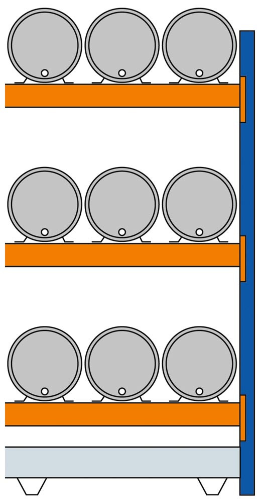 ∙ Rahmen aus Stahl, blau kunststoffbeschichtet ∙ Verstrebungen aus Stahl, verzinkt ∙ Holme aus Stahl, orange kunststoffbeschichtet ∙ Auffangwannen und Fassauflagen verzinkt ∙ Sonderausführungen wie z. B. Fass-Freilagerregale komplett mit Dach, sind auf Anfrage lieferbar ∙ Belastung pro Ebene bis 2300 kg (bei gleichmäßig verteilter Last)