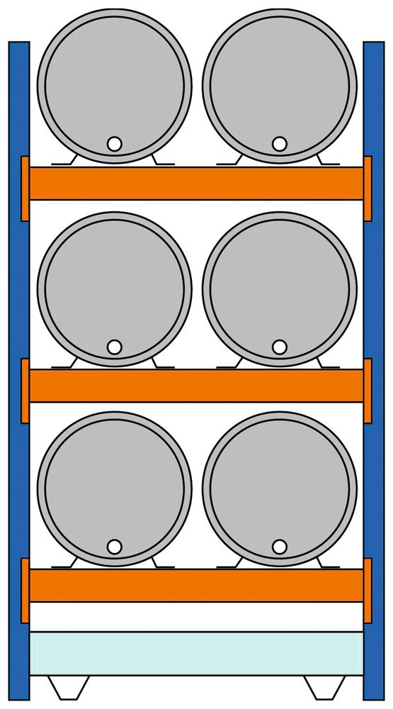 Fassregal, GF, für 6x200 l-Fässer, liegende Lagerung, mit Auffangwanne 375 l, BxTxH 2225x850x2000 mm EP510163