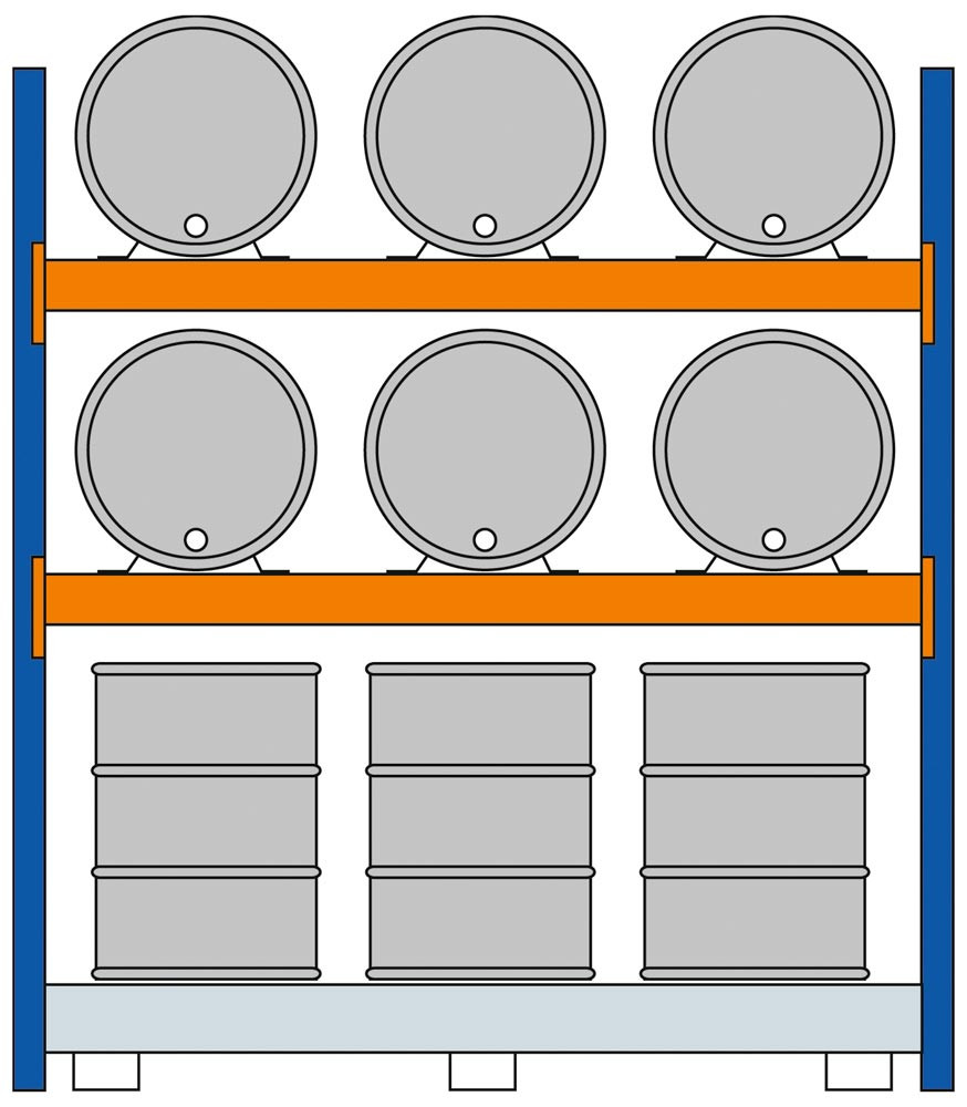 ∙ Rahmen aus Stahl, blau kunststoffbeschichtet ∙ Verstrebungen aus Stahl, verzinkt ∙ Holme aus Stahl, orange kunststoffbeschichtet ∙ Auffangwannen und Fassauflagen verzinkt ∙ Sonderausführungen wie z. B. Fass-Freilagerregale komplett mit Dach, sind auf Anfrage lieferbar ∙ Belastung pro Ebene bis 2300 kg (bei gleichmäßig verteilter Last)