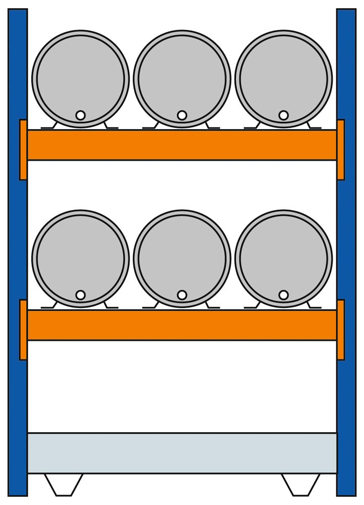 ∙ Rahmen aus Stahl, blau kunststoffbeschichtet ∙ Verstrebungen aus Stahl, verzinkt ∙ Holme aus Stahl, orange kunststoffbeschichtet ∙ Auffangwannen und Fassauflagen verzinkt ∙ Sonderausführungen wie z. B. Fass-Freilagerregale komplett mit Dach, sind auf Anfrage lieferbar ∙ Belastung pro Ebene bis 2300 kg (bei gleichmäßig verteilter Last)