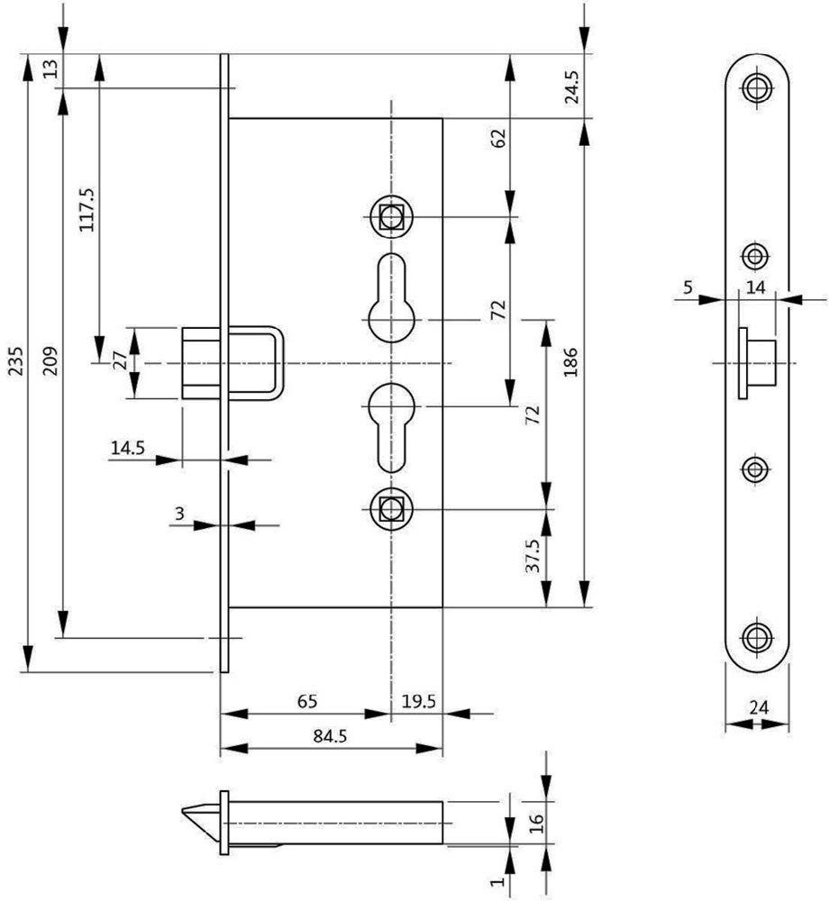 PZW Ausführung · für Feuerschutzabschlüsse T30-1 · allseitig geschlossener Schlosskasten · mit Wechsel · abgerundet · Stulp verzinkt · Falle und Riegel aus Stahl · Stulplänge 235 mm · ohne Schließblech · Vierkant 9 mm · Entfernung 72 mm