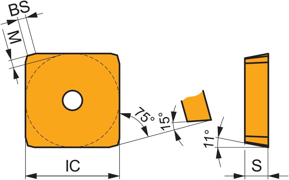 Einseitige Fräswendeschneidplatte SPKN 1203 mit einem ebenen Spanwinkel · Viereckig rechtsschneidend für eine maximale Schnitttiefe von 9.0mm · mit eine Indexierungsgenauigkeit gemäß ISO-Toleranzklasse-K mit verrundeter und facettierter Schneidkante · S26 unbeschichtet WC-(Ti · Ta · Nb)C-Co Substrat
