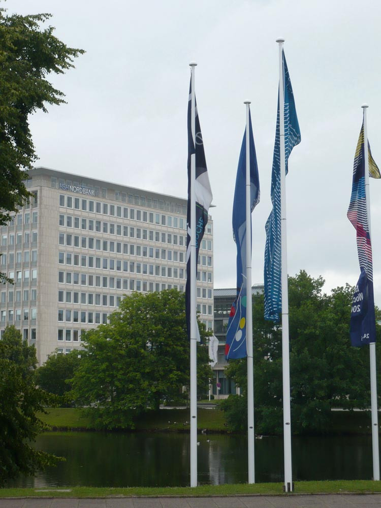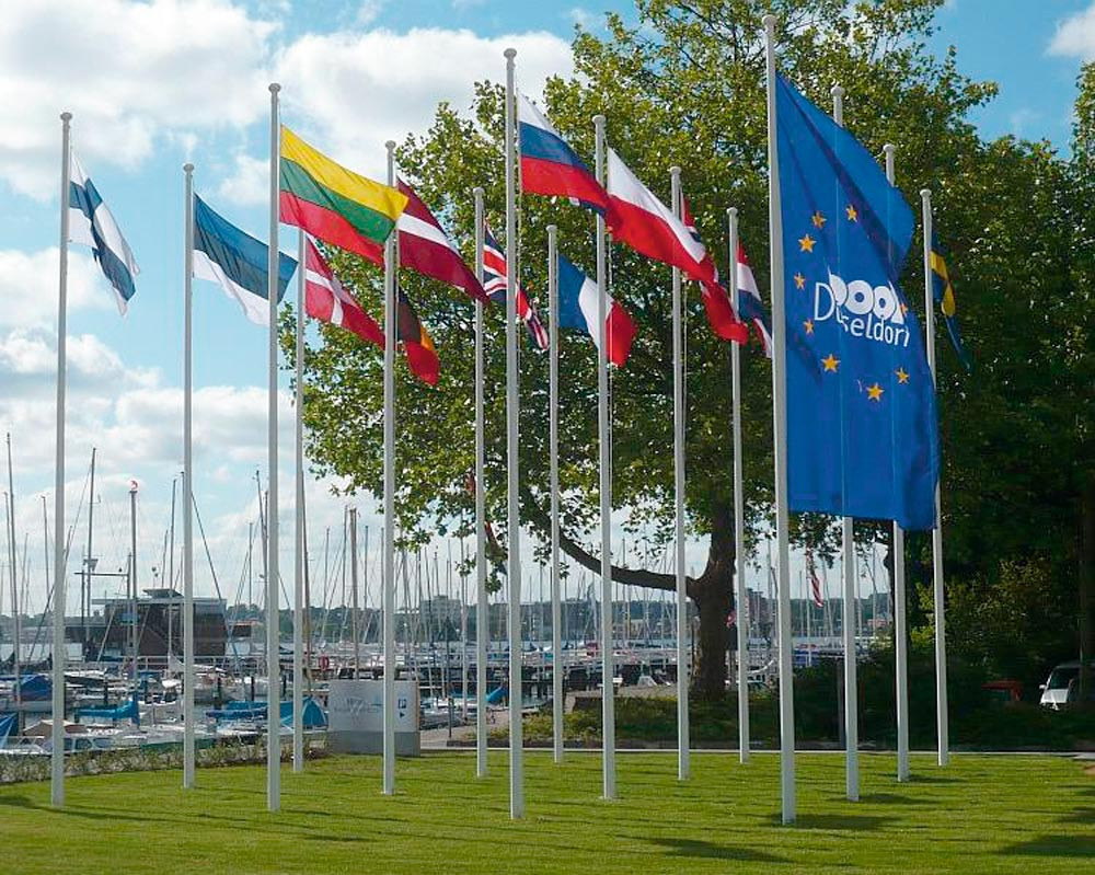 ∙ Eine Mastspitze, passende Flaggenleine, ein weißer Leinenhalter (Klampe) und eine Boden-Kipphalterung zum Einbetonieren