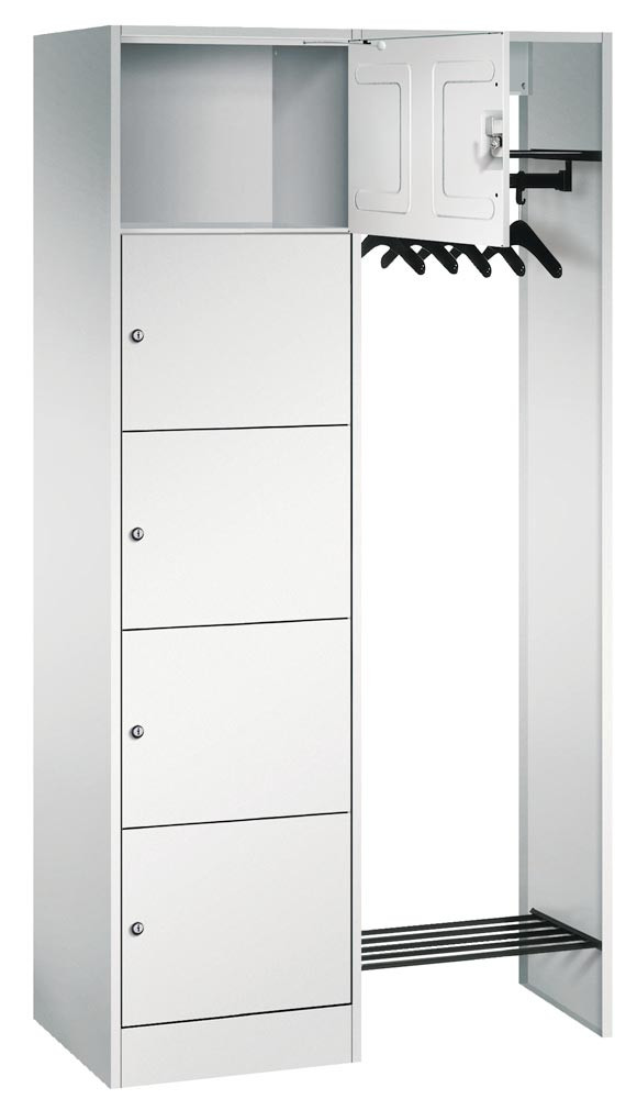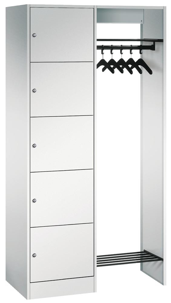 Schließfachschränke mit 5 Fächern übereinander bieten in Kombination mit funktionalen Garderobeneinheiten für 5, 10, 15 oder 20 Personen ausreichend Platz für Kleidung und persönliche Dinge.
