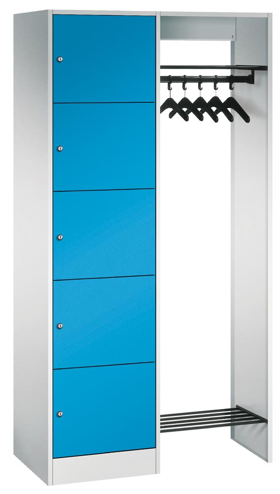 Schließfachschränke mit 5 Fächern übereinander bieten in Kombination mit funktionalen Garderobeneinheiten für 5, 10, 15 oder 20 Personen ausreichend Platz für Kleidung und persönliche Dinge.