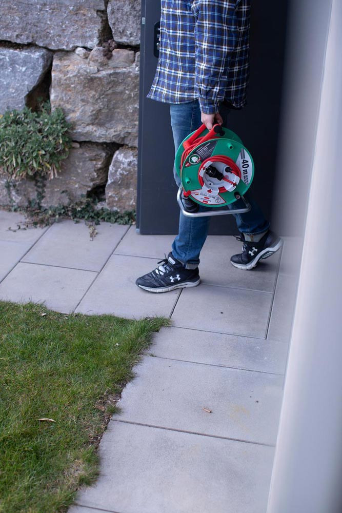 aus Spezialkunststoff auf verzinktem Tragegestell mit zusätzlichem Überhitzungsschutz und Kontroll-Leuchte bei Überhitzung und Überlastung · Trommel-Ø 290 mm · für Rasenmäher mit cleverem Pendelgriff "CABLEPILOT", für freie Hände beim Transport, praktischen Aufhängen und schnellen Ab- und Aufrollen · Verlängerungskabeltrommel mit Stecker und Kupplung mit innovativer Brennenstuhl® Bretec®-Drehkontakt-Technik: Der Trommelkörper läuft getrennt von der Steckdoseneinheit bzw. vom Netzstecker-Anschluss · · Gummikabel AT-N05V3V3-F 3G1,5 für die kurzzeitige Verwendung im Freien