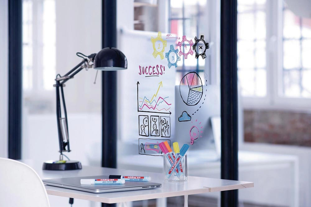 deckend und sofort einsatzbereit · einfach trocken abwischbar · Glasmarker zum Schreiben und Markieren auf den meisten Glasoberflächen und Glasboards - auch für Whiteboards geeignet
