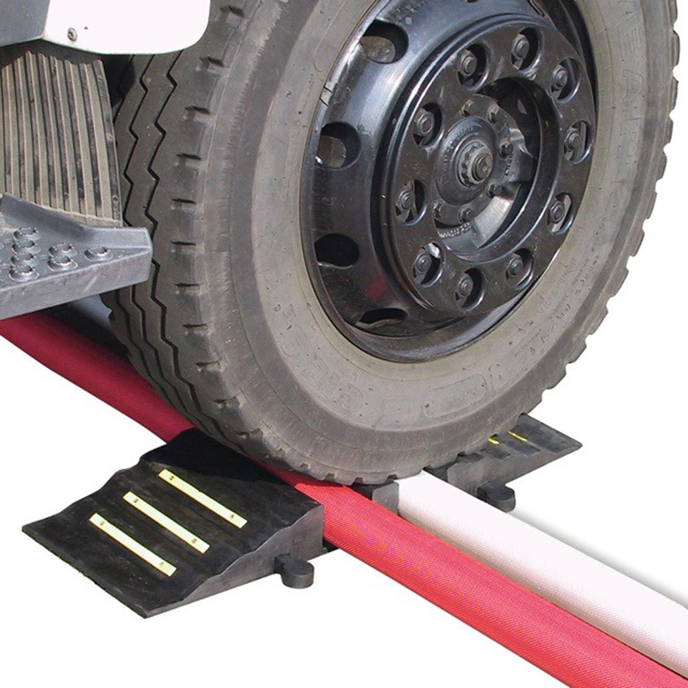 ineinandergreifende Brücke · aus hochverstärktem Gummi · geeignet für schwere LKW · ca. 30 cm breite Einheiten, die schnell zu der gewünschten Brückenbreite zusammengesteckt werden können · leicht zu befördern · geeignet für einzelne und doppelte Schlauchleitungen · rutschfeste Unterschicht für optimale Bodenhaftung · zuverlässige und wartungsfreie Handhabung · mit reflektierenden Streifen · Tragfähigkeit 44 t