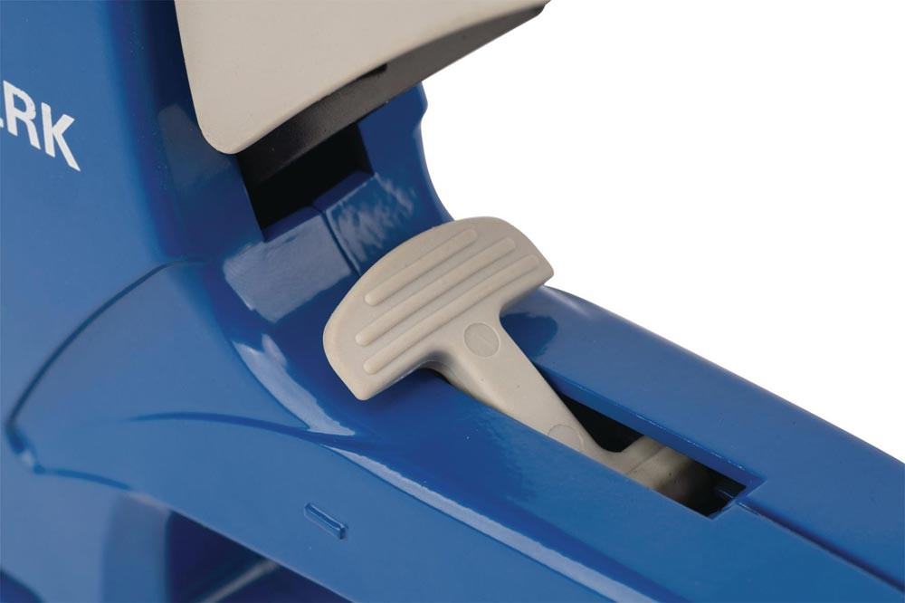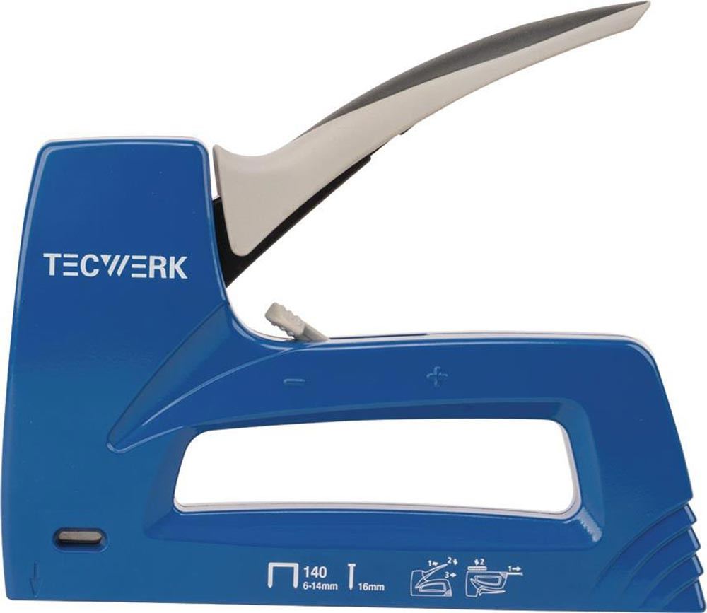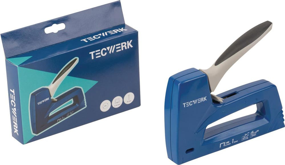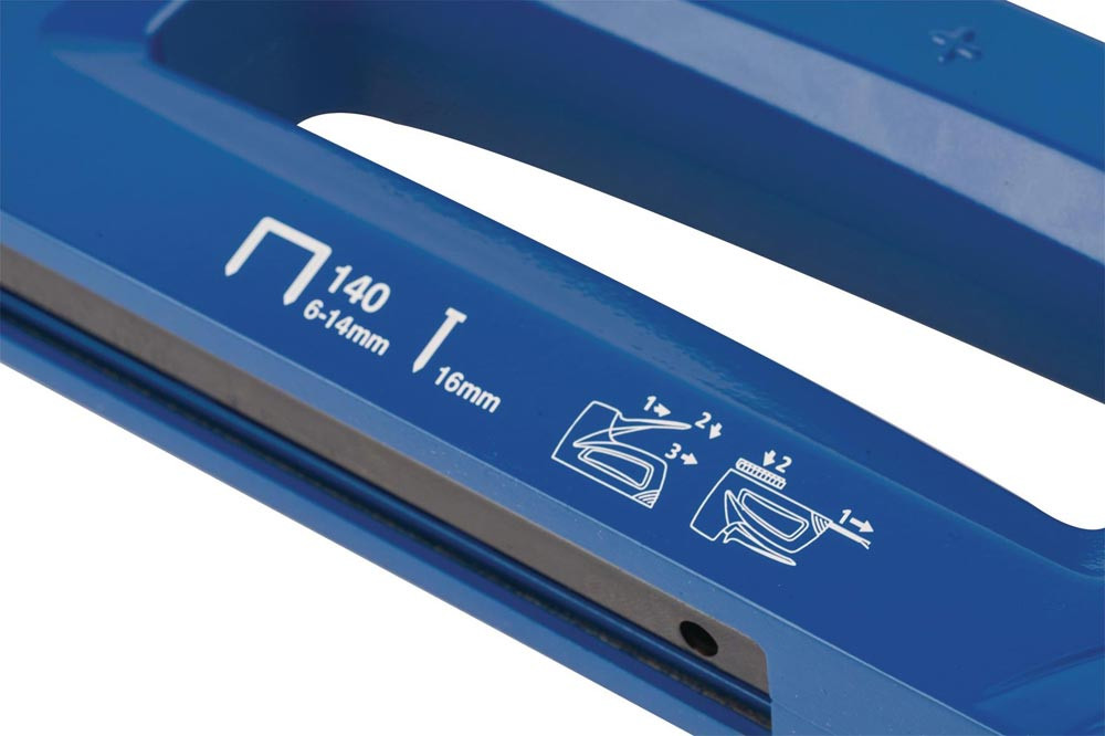 aus stabilem Aluminium-Druckguss · leicht zugängliches Tackermagazin · für Klammern bis 14 mm Länge · mit ergonomischem 2-Komponentengriff