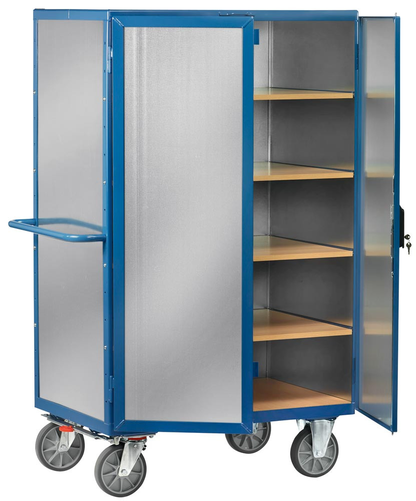 ∙ Schweißkonstruktion aus Winkelstahl ∙ Mit Rohrschiebegriff ∙ Doppelflügeltür, Stirnwände, Längswand und Dach mit 1 mm starkem, verzinkten Stahlblech verkleidet ∙ Tür mit Treibriegelverschluss und eingebautem Zylinderschloss ∙ Rahmen RAL 5007 brillantblau pulverbeschichtet ∙ Schlag- und kratzfest ∙ 1 fester und 4 verstellbare Böden aus Holzwerkstoffplatte mit Buchendekor ∙∙ 2 Lenk- und 2 Bockrollen ∙ TPE-Bereifung ∙ Naben mit Präzisions-Rillenkugellager · Inkl. TOTALSTOP-Zentralbremssystem