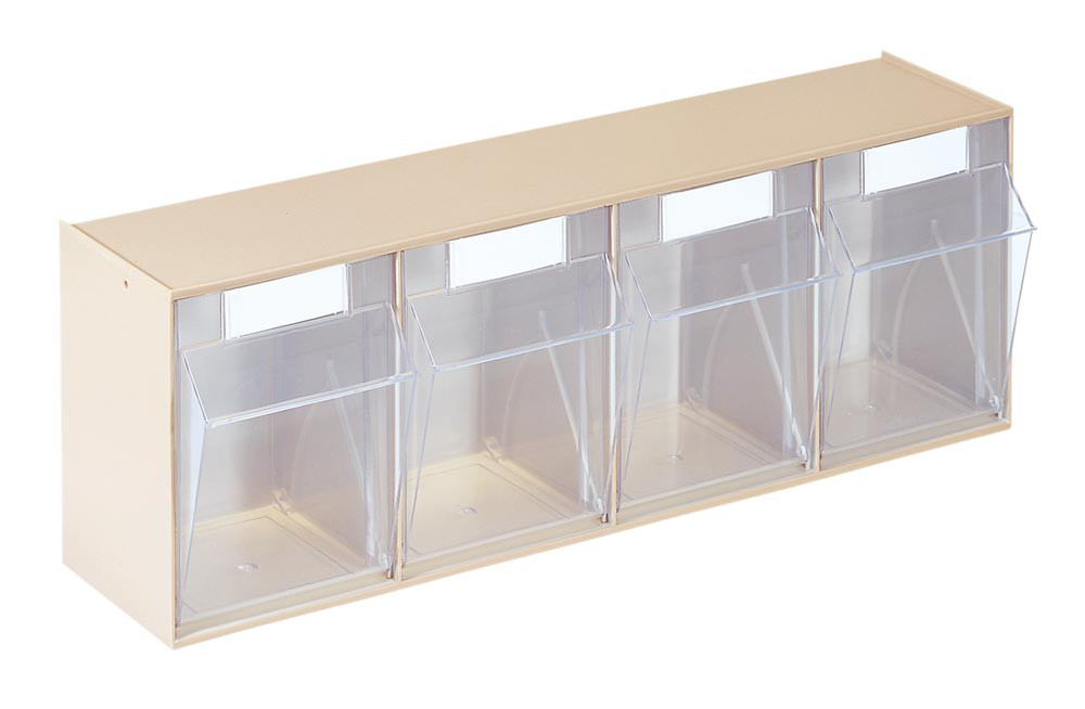 Klarsichtbehälter aus Kunststoff in weißem Gehäuse aus schlagfestem Polystyrol · Behälter sind zur Entnahme nach vorn schwenkbar und lassen sich herausnehmen · Gehäusebreite 600 mm · stapelbar und für die Wandbefestigung geeignet