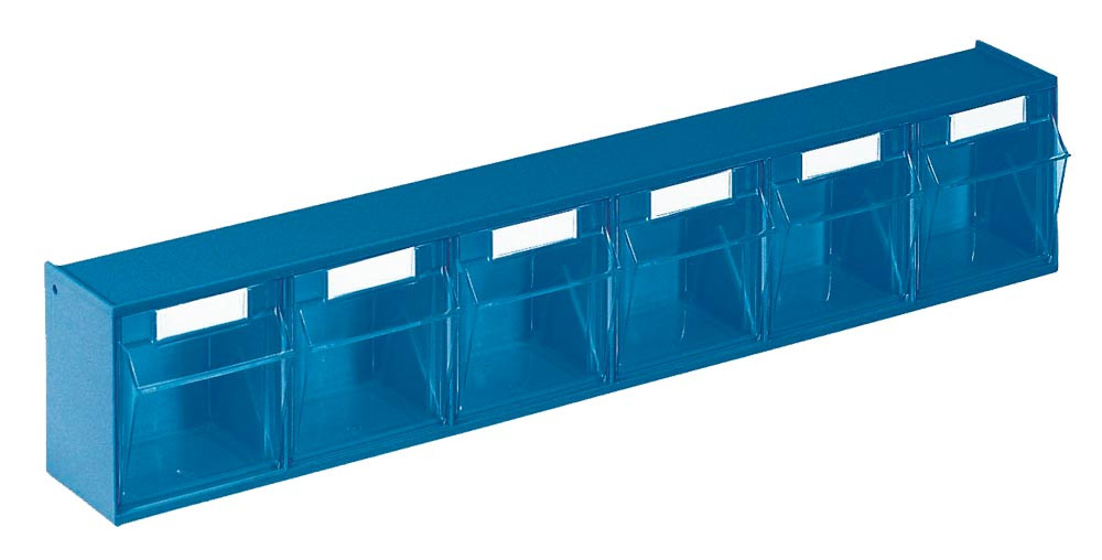 Klarsichtbehälter aus Kunststoff in blauem Gehäuse aus schlagfestem Polystyrol · Behälter sind zur Entnahme nach vorn schwenkbar und lassen sich herausnehmen · Gehäusebreite 600 mm · stapelbar und für die Wandbefestigung geeignet