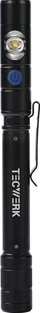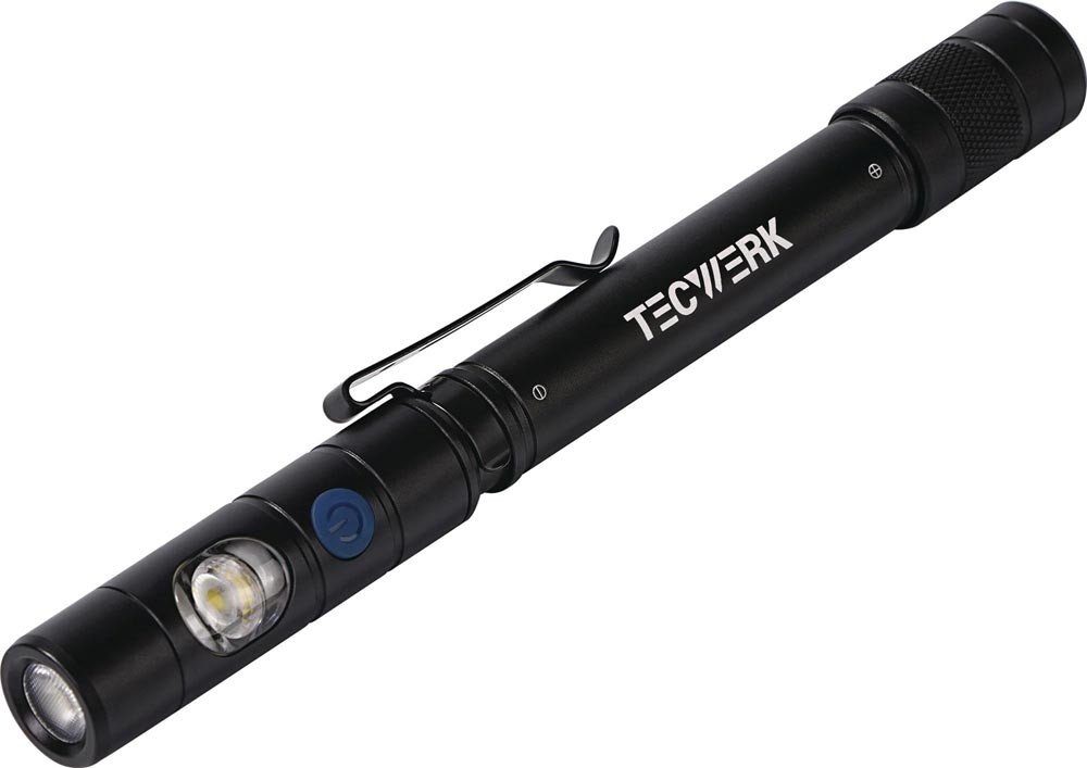 wiederaufladbare Stiftleuchte mit 2 leistungsstarken CREE LED XTE · 1 LED vorne, 1 LED seitlich mit jeweils 2 Leuchtstufen (110/400 lm bzw. 60/160 lm) · Gürtelclip · Magnet an der Unterseite · Aluminiumgehäuse · Ladestandsanzeige