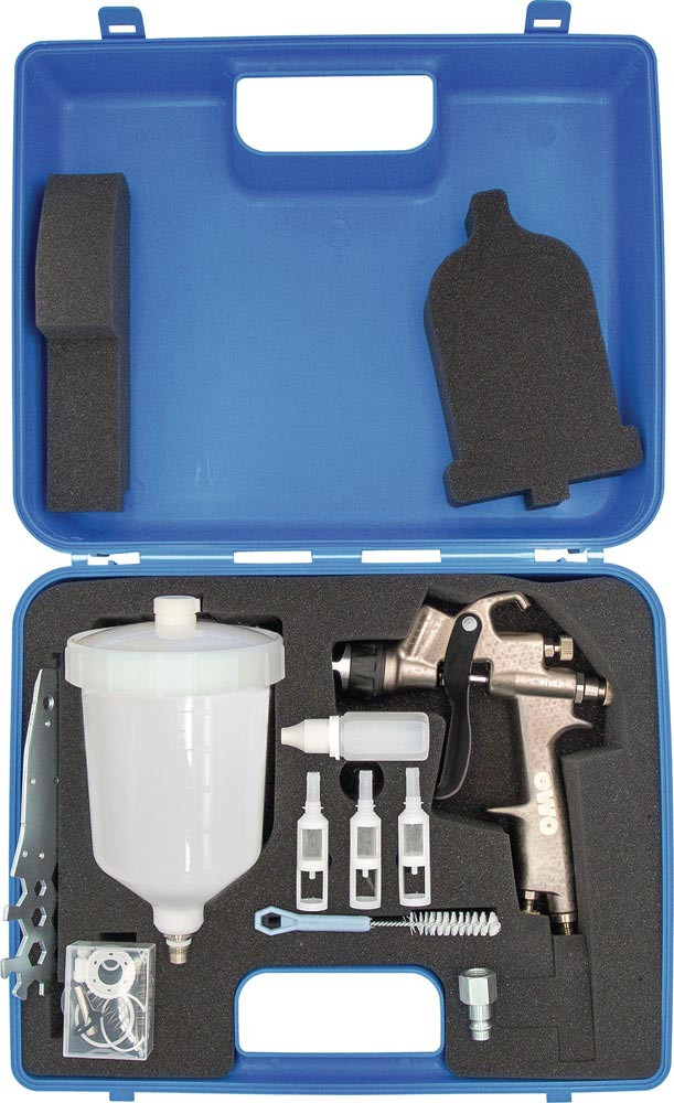 die leistungsfähige Allround-Lackierpistole mit HVLP-Technologie, für Industrie und Handwerk · Zerstäubungsdruck max. 0,7 bar (Düseninnendruck) · durch die serienmäßigen Edelstahldüsenkomponenten können auch Decklacke, Füller und Grundierungen auf Wasserbasis verarbeitet werden · Inhalt: Lackierpistole (Druckluftanschluss G 1/4"), Düse Ø 1,3 mm, Fließbecher 500 ml (Kunststoff), Ersatzteilset (Dichtungen und Federn), Düsenschlüssel, Reinigungsset, G 1/4" Stahlkupplungsstecker, Pflegeöl
