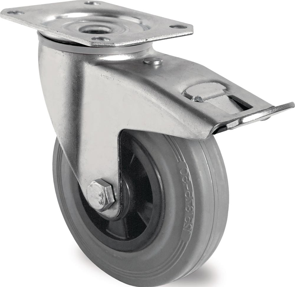 Lenkrolle mit Totalfeststeller Rad-Ø 160 mm Tragfähigkeit 135 kg mit Anschraubplatte Rollenlager Vollgummi grau
