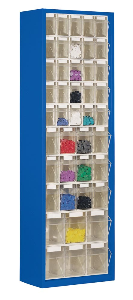 Magazinschrank, BxTxH 665x250x2000 mm, 43 Kästen, 25xGr. 5, 12xGr. 4, 6xGr. 3, Gehäusefarbe RAL 5010 enzianblau