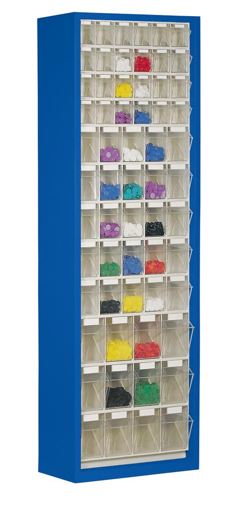 Magazinschrank, BxTxH 665x250x2000 mm, 61 Kästen, 24xGr. 6, 25xGr. 5, 12xGr. 4, Gehäusefarbe RAL 5010 enzianblau