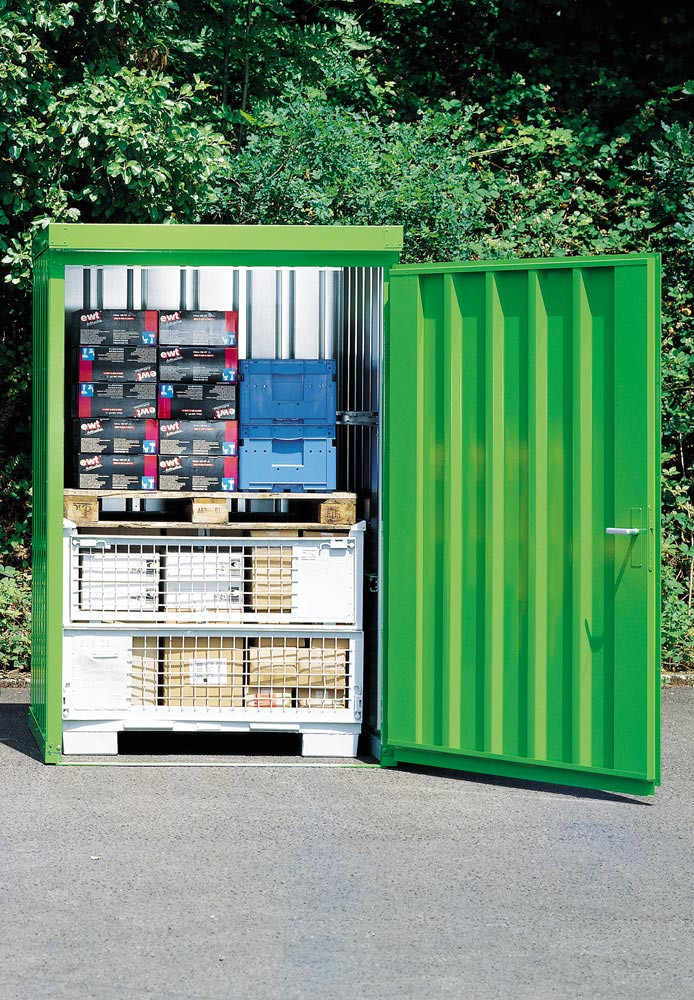 Materialbox aus Trapezblechen, verzinkt, mit Holzfußboden, mit hochstellbarem Dach, BxTxH 1430x1050x1475 mm EP513719