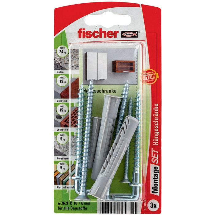 Das fischer Montageset Hängeschrank beinhaltet alle Elemente zur sicheren Befestigung von Hängeschränken: 2 fischer Dübel UX 10x60 mit ausgeprägtem Rand aus hochwertigem Nylon · 2 Spanplattenschrauben 6x85 mit Senkkopf · 2 Winkelhaken mit Beffe · 1 fischer Dübel UX 6x35 mit ausgeprägtem Rand · 1 Spanplattenschraube 4,5x60 mit Senkkopf.