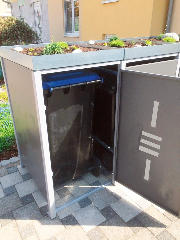 Mülltonnenverkleidung aus feuerverzinktem Stahlblech, BxTxH 1960x830x1215 mm m. Pflanzdach, für 3 Tonnen, Stanzung 2/3, Farbe DB703/RAL9007