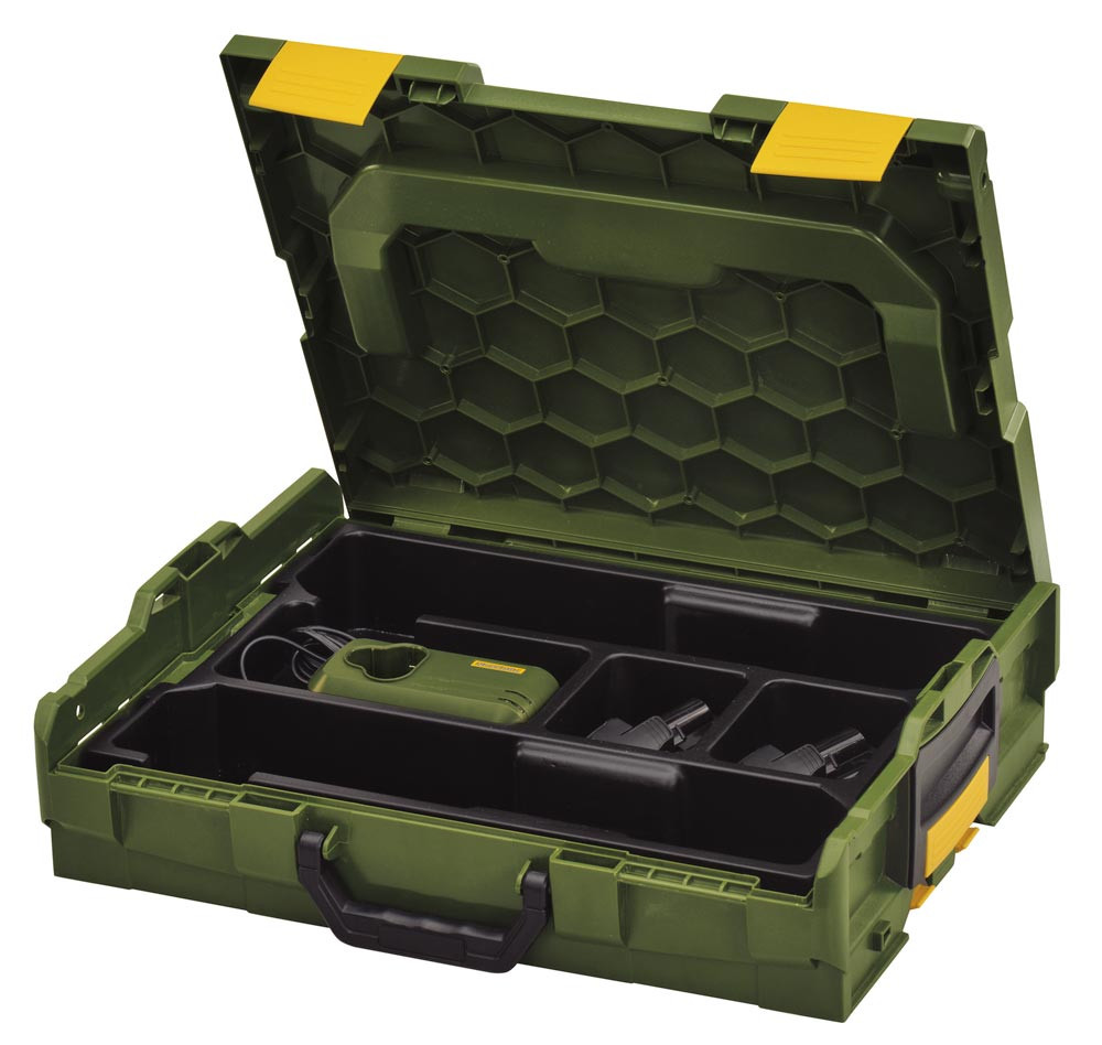 Extrem flache L-BOXX mit zwei Li-Ionen-Akkus Li/A2 und Akku-Schnellladegerät LG/A2 ∙ Ermöglicht bedarfsgerechte Geräteauswahl für Gewerke wie Metall- und Geländerbau, Automobilbereich, Innenausbau, Instandhaltung ∙ Mit reichlich Platz für Zubehör mit hochwertiger Formeinlage zur Aufnahme von zwei Akku-Geräten.