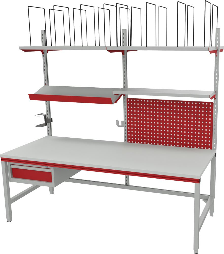 · Tisch höheneinstellbar von 690 bis 960 mm · Maximale Flächenbelastung 300 kg · Farbe RAL 9006 weißaluminium, Akzentfarbe RAL 3003 rubinrot